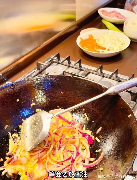 后来,切五花肉的场景就没再展示了,等到准备好茄子之后,镜头一转就直接切到姜了。一小块姜被贾冰的小手切得比土豆丝还细,脸上的刀工一看就知道是行内的厨师。