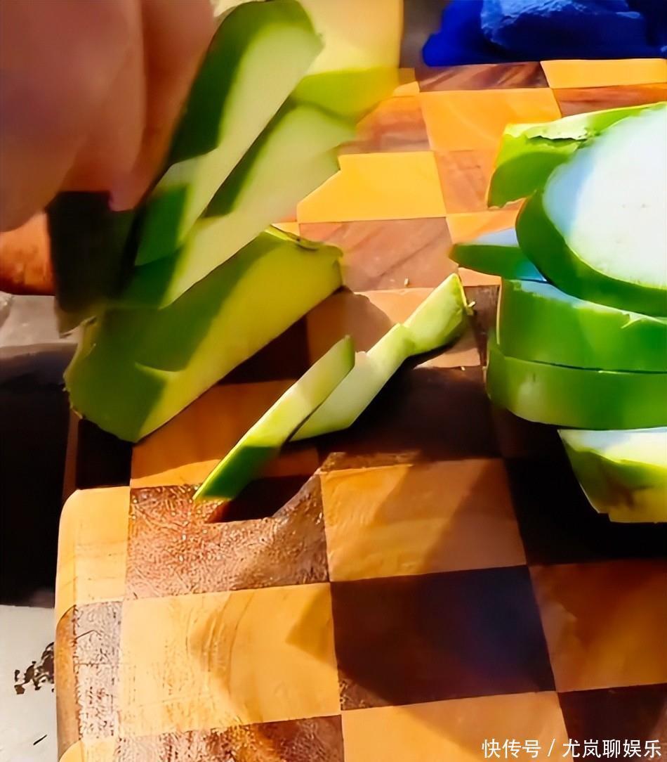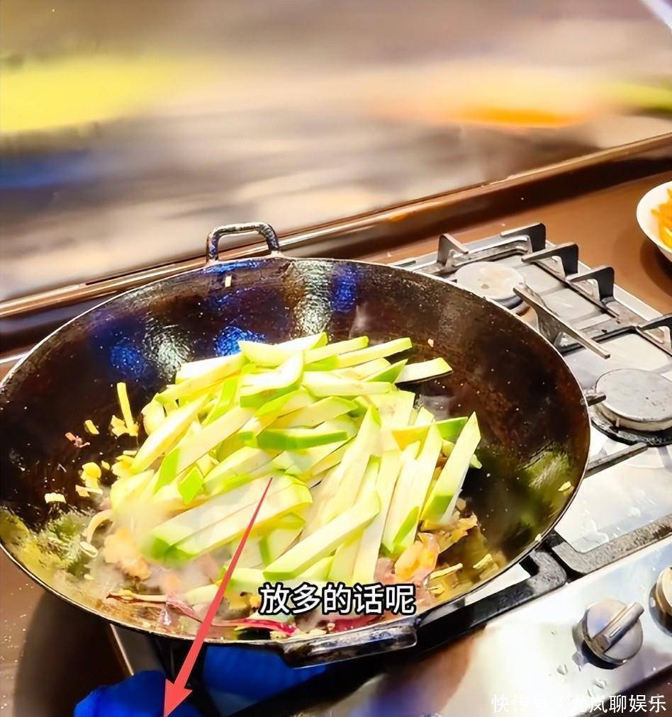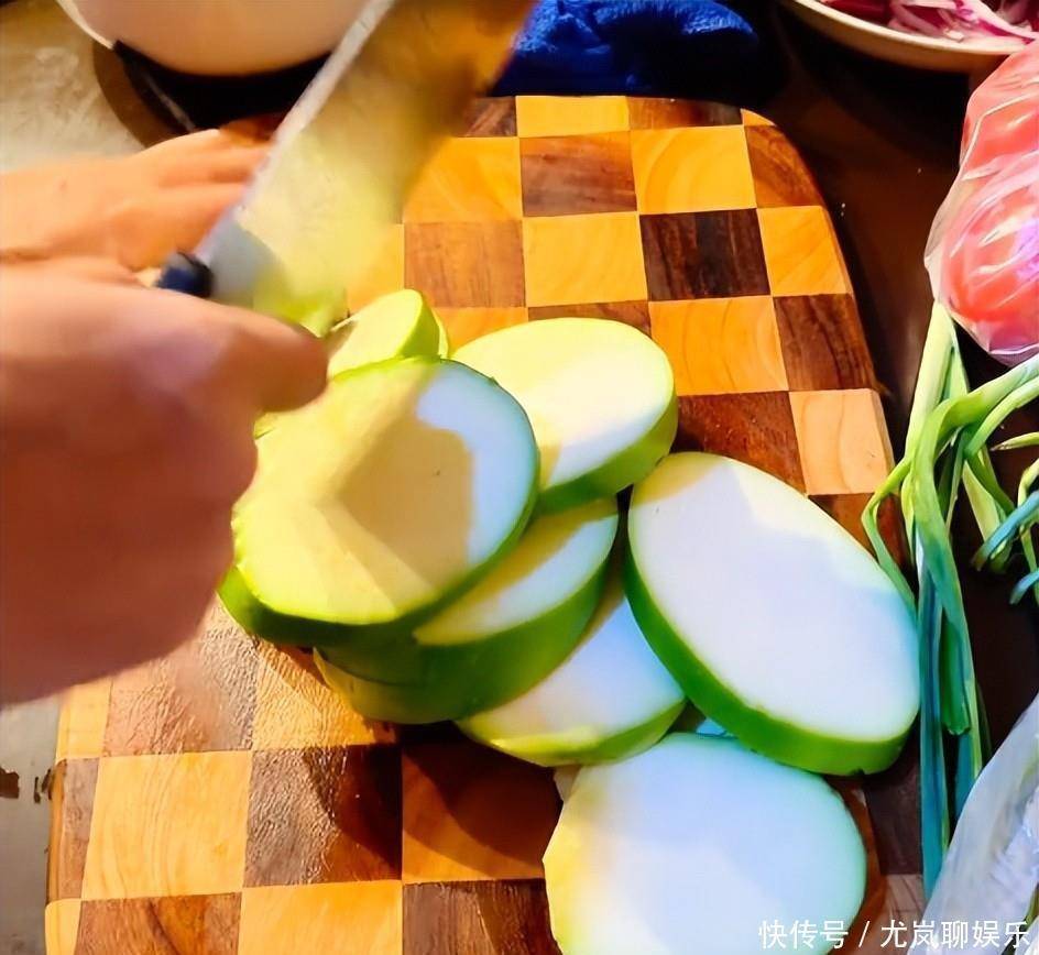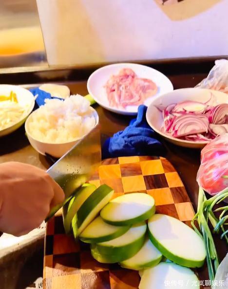 一开场,镜头就对准了他们家的厨房,贾冰手里拿着个茄子,正在切块儿。一边切着茄子,一边说呢,这货水分挺足的。