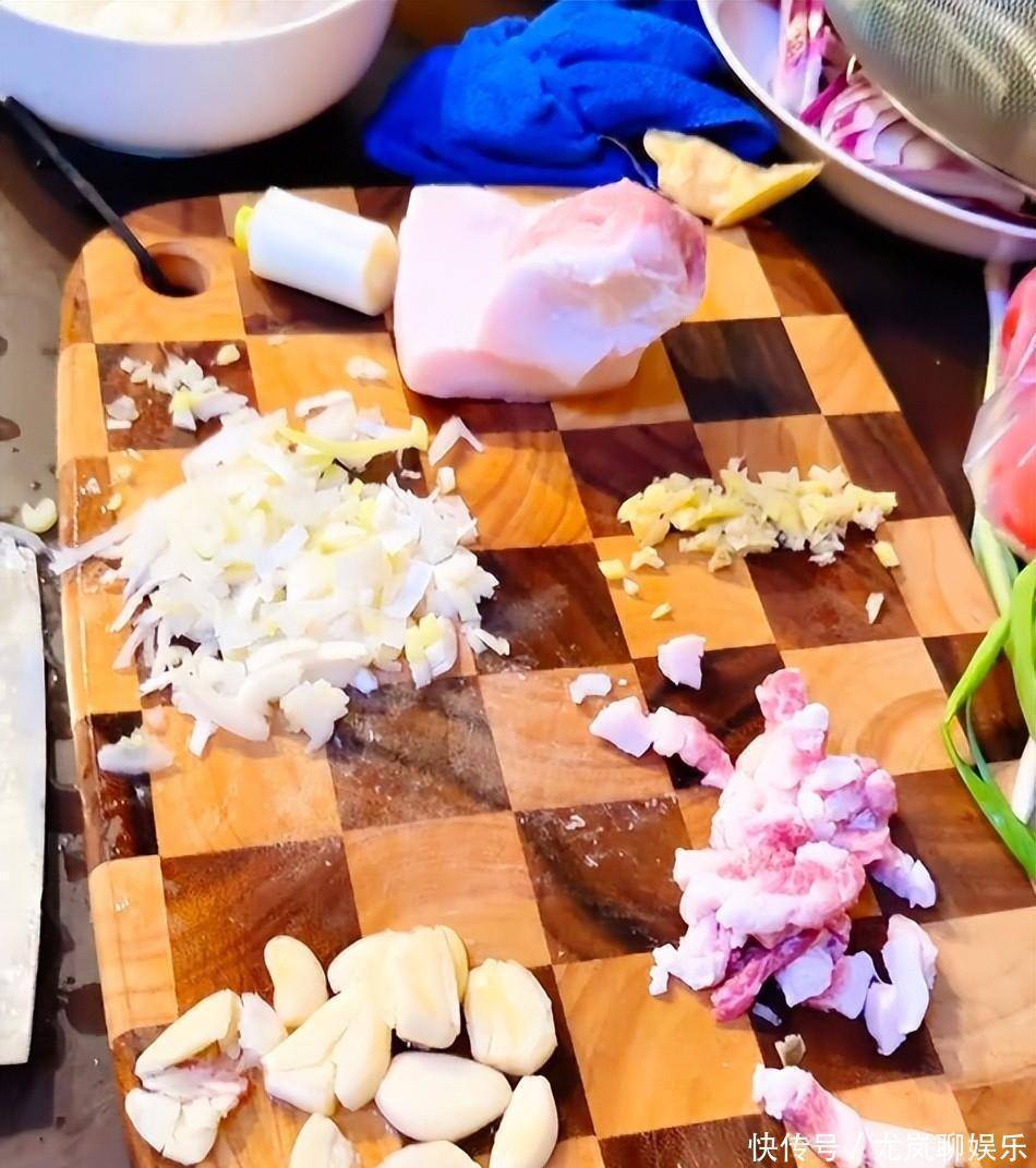 姜切完了,接着葱也跟着切得飞快,刀法像流水一般顺畅。只看他切的这几样配料,这饭还能不好吃嘛!葱、姜、蒜一齐就位,简直就是好菜的开端啦!